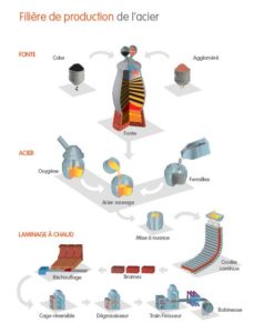 La préservation des ressources et leur recyclage sont néanmoins pris en compte dès l’étape de production de fonte dans les trois haut-fourneaux de l’usine. D’une capacité de 6,8 millions de tonnes, les hauts-fourneaux dunkerquois n’intègrent que cinq kilos de ferrailles par tonne de métal produite, alors que les aciéries électriques consomment 100 % de ferrailles pour leur production comme celle d’ArcelorMittal Industeel du Creusot qui enfourne entre 50 000 et 70 000 t/an de ferrailles, sans compter les chutes internes. C’est en effet lors de l’étape suivante, à l’aciérie, que la fonte est transformée en acier et que les ferrailles sont ajoutées. Cela n’empêche pas une innovation constante en vue de valoriser un maximum de co-produits industriels à Dunkerque. A commencer par les gaz de cokerie, composés entre autres de soufre. ArcelorMittal a investi en 1998 et 2015, dans un procédé d’extraction dans les gaz, de soufre pur à 99 %. Celui-ci qui était alors un polluant, est ainsi aujourd’hui valorisé dans l’industrie de la peinture et de la cosmétique.